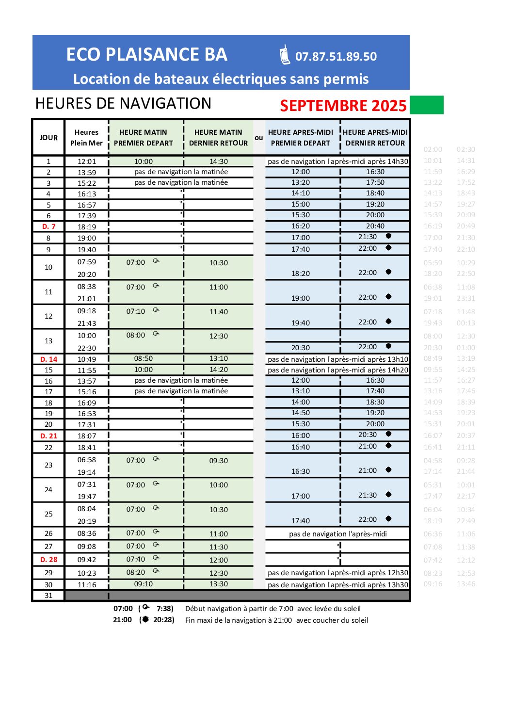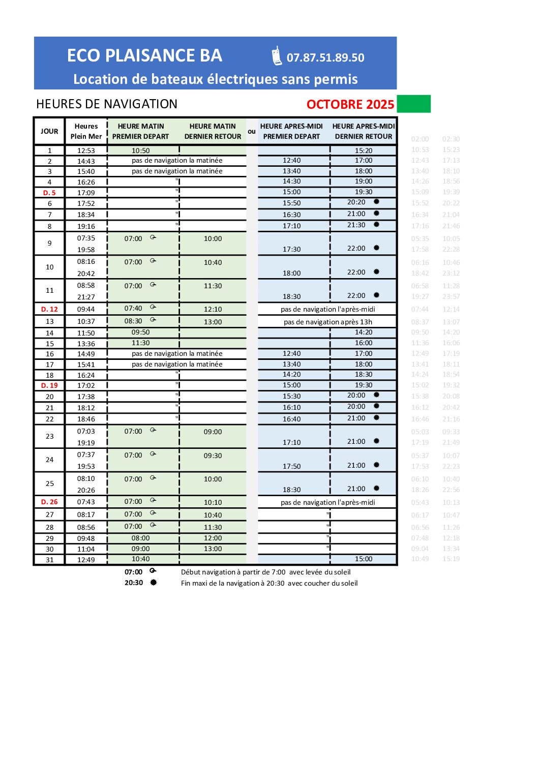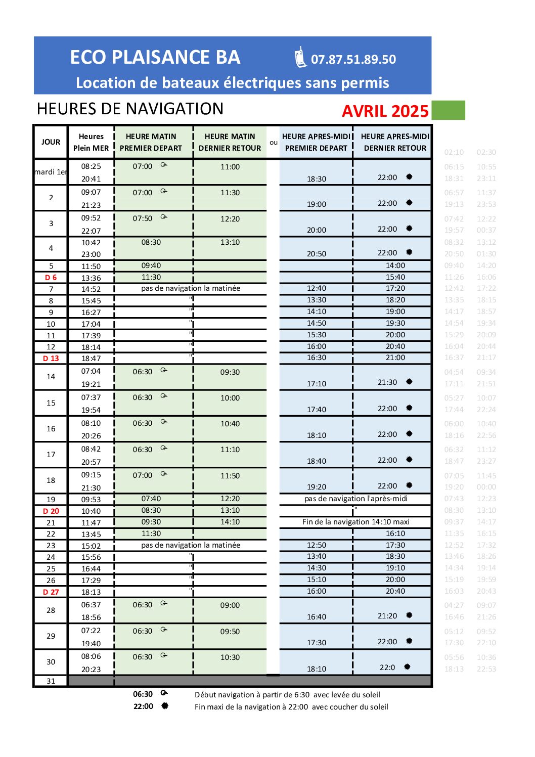 Les horaires de navigation en bateaux sont contraints par les horaires des marées que vous pouvez télécharger dans les documents ci-dessous, en fonction de la date qui vous convient.